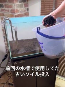 ②新しいソイルと古い(以前水槽に使った)ソイルを1:1の割合で敷く※ない場合はオール新品でOK、古いソイルを入れた方が、立ち上がり(バクテリアの定着)が早くなります。